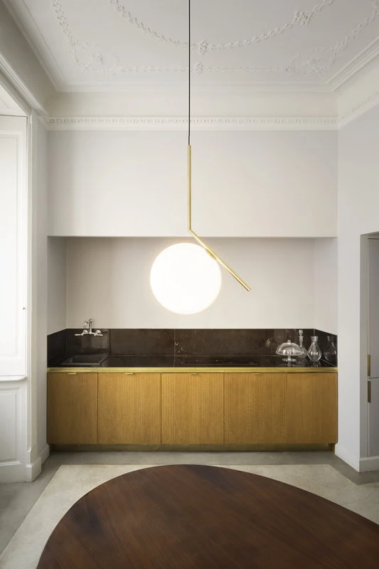 Italialaisen Flosin IC S2 -riippuvalaisin on osa Michael Anastassiadesin vuonna 2014 suunnittelemaa IC-valaisinkokoelmaa, jossa teollinen yksinkertaisuus kohtaa elegantin symbolismin. IC-valaisimet koostuvat erilaisiin kulmiin asettuvista metallirungoista ja pyöreistä valkoisista opaalilasivarjostimista, joiden lävitse valo siivilöityy puhtaasti ja pehmeästi. Valaisinten ilmeen kruunaa messinkirungon lämmin hohde.