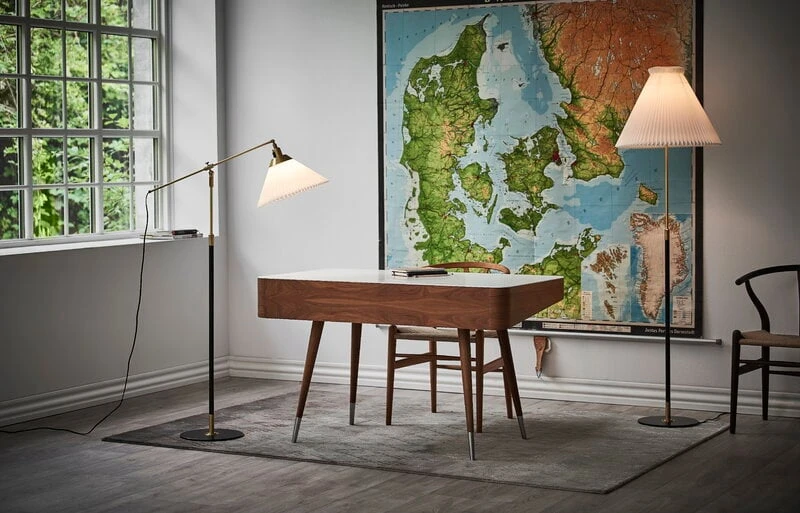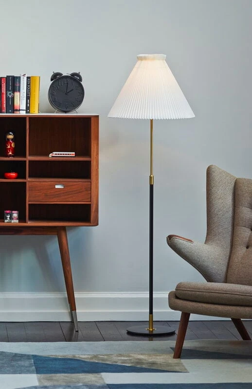 Le Klintin valaisinmalli 351 hurmaa klassisella ilmeellään, jonka kruunaa tanskalaisvalmistajalle tyypillinen vekkivarjostin. Aage Petersenin vuonna 1970 suunnittelema lattiavalaisin on korkeussäädettävä, ja se on saatavana sekä klassisella paperisella että modernilla muovisella varjostimella.