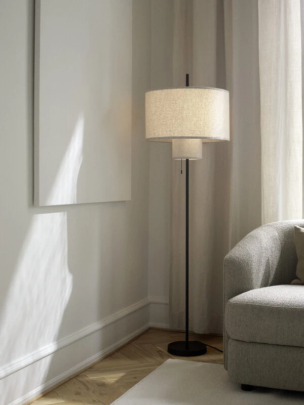 New Worksin Margin on muotoilija John Astburyn suunnittelema lattiavalaisin, jonka kerrostettu kangasvarjostin on suunniteltu suodattamaan valo pehmeäksi ja miellyttäväksi – tarkoituksena on luoda tilaan lämmin, kutsuva tunnelma. Särmää hillittyyn kokonaisuuteen tuo valaisimen geometrinen muotokieli sekä pystysuunnassa varjostimien läpi kulkeva suora linja.