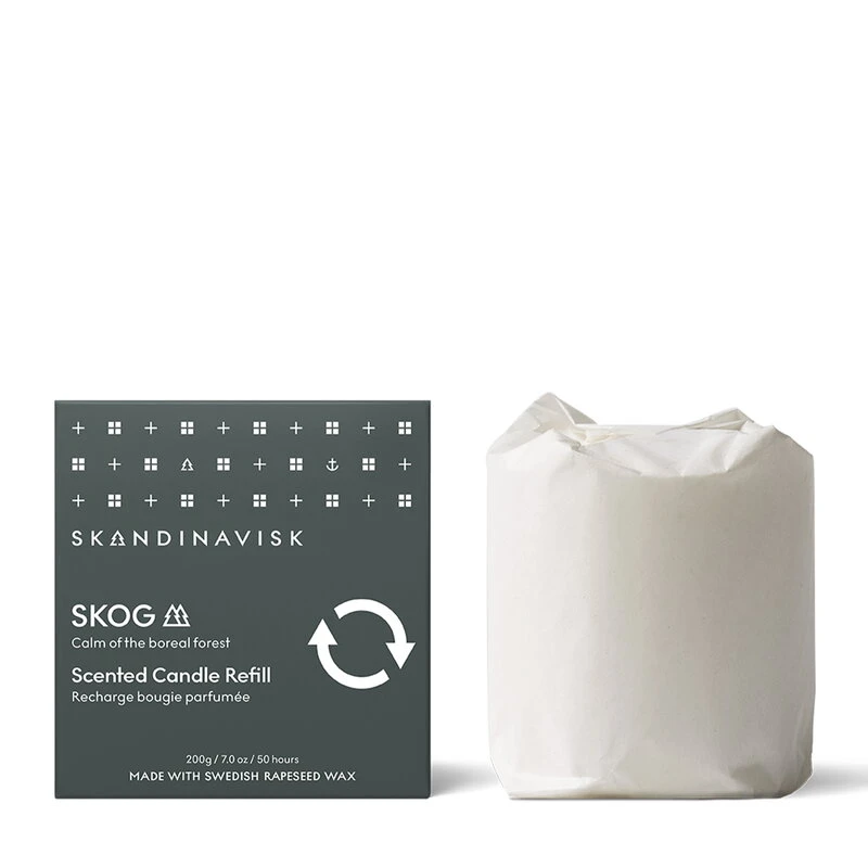 Skandinaviskin Skog-tuoksukynttilässä voi aistia männyn, kuusen, kielon ja koivumahlan tuoksun. Nimensä mukaisesti Skog kuvaa pohjoisten havumetsien ainutlaatuista tuoksumaailmaa.