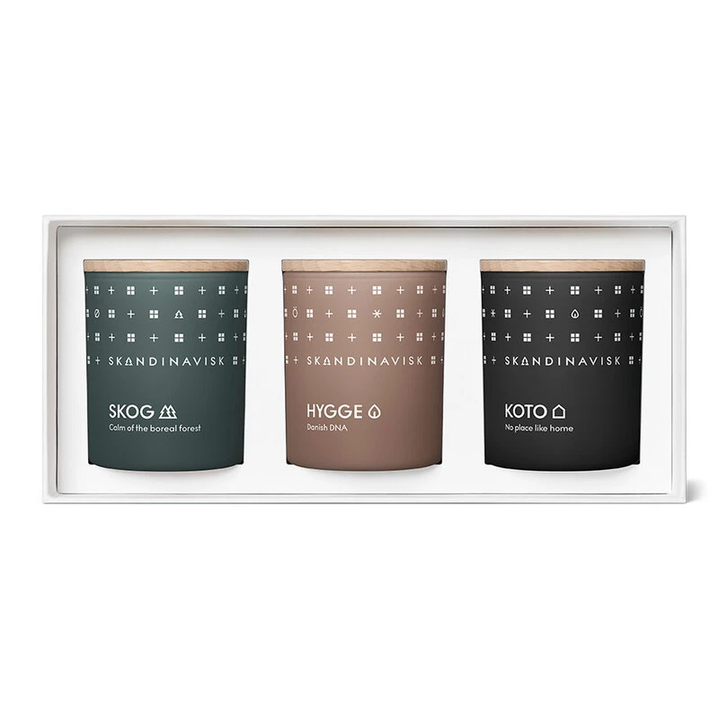 Skandinaviskin Hibernate-tuoksukynttiläsettiin kuuluu kolme pientä tuoksukynttilää, joissa tuoksuvat pohjoismaisesta luonnosta innoituksensa saaneet aromit. Kauniissa lahjapakkauksessa toimitettavat puukantiset tuoksukynttilävät palavat noin 20 tunnin ajan.